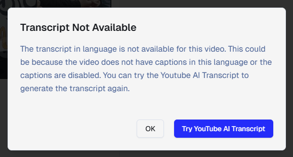 - If no captions ā "Try YouTube AI Transcript" button appears